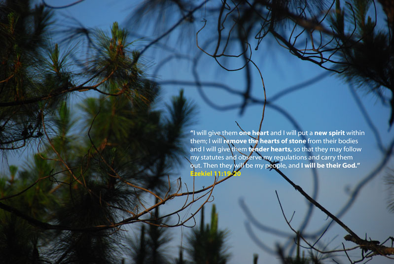 “I will give them one heart and I will put a new spirit within them; I will remove the hearts of stone from their bodies and I will give them tender hearts, so that they may follow my statutes and observe my regulations and carry them out. Then they will be my people, and I will be their God.” Ezekiel 11:19-20